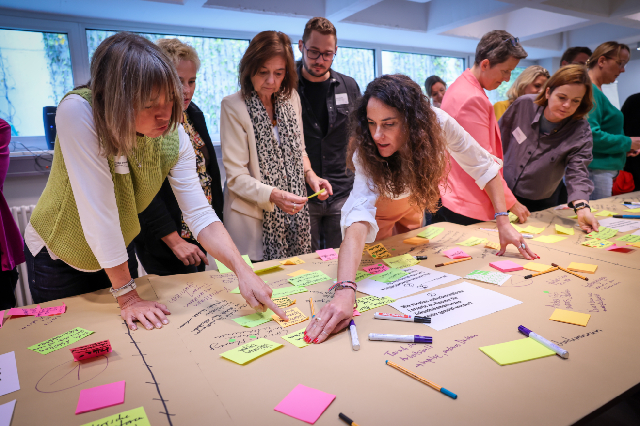 Zum Abschluss des Talente-Forums erhöhte Leonard Sommer nochmal das Tempo der Veranstaltung: Gemeinsam mit der Gruppe setzte er die Kreativmethode „Speed Ideation“ um. Die Idee: Eine große Menge an unterschiedlichen Einfällen in kürzester Zeit und bei jeder Menge Spaß zu generieren. Musikalisch begleitet von AC/DC, Yann Tiersen oder Pharrell Williams hatten die Teilnehmenden zehn Minuten Zeit, sich zu überlegen, wie Zukunftskompetenzen vermittelt und von Führungskräften angestoßen oder aber außerbetriebliche Lernorte geschaffen werden können. Dabei wanderten sie zu verschiedenen Stationen und hielten ihre Ideen auf Post-its fest. Die Ergebnisse machten Lust auf mehr und stellten konkrete Ansatzpunkte dar, um Unternehmen weiterzubringen: darunter waren die Hospitanz in anderen Unternehmen und sozialen Einrichtungen, interne Rollentausche oder Open Houses als Netzwerk- und Weiterbildungsplattform.