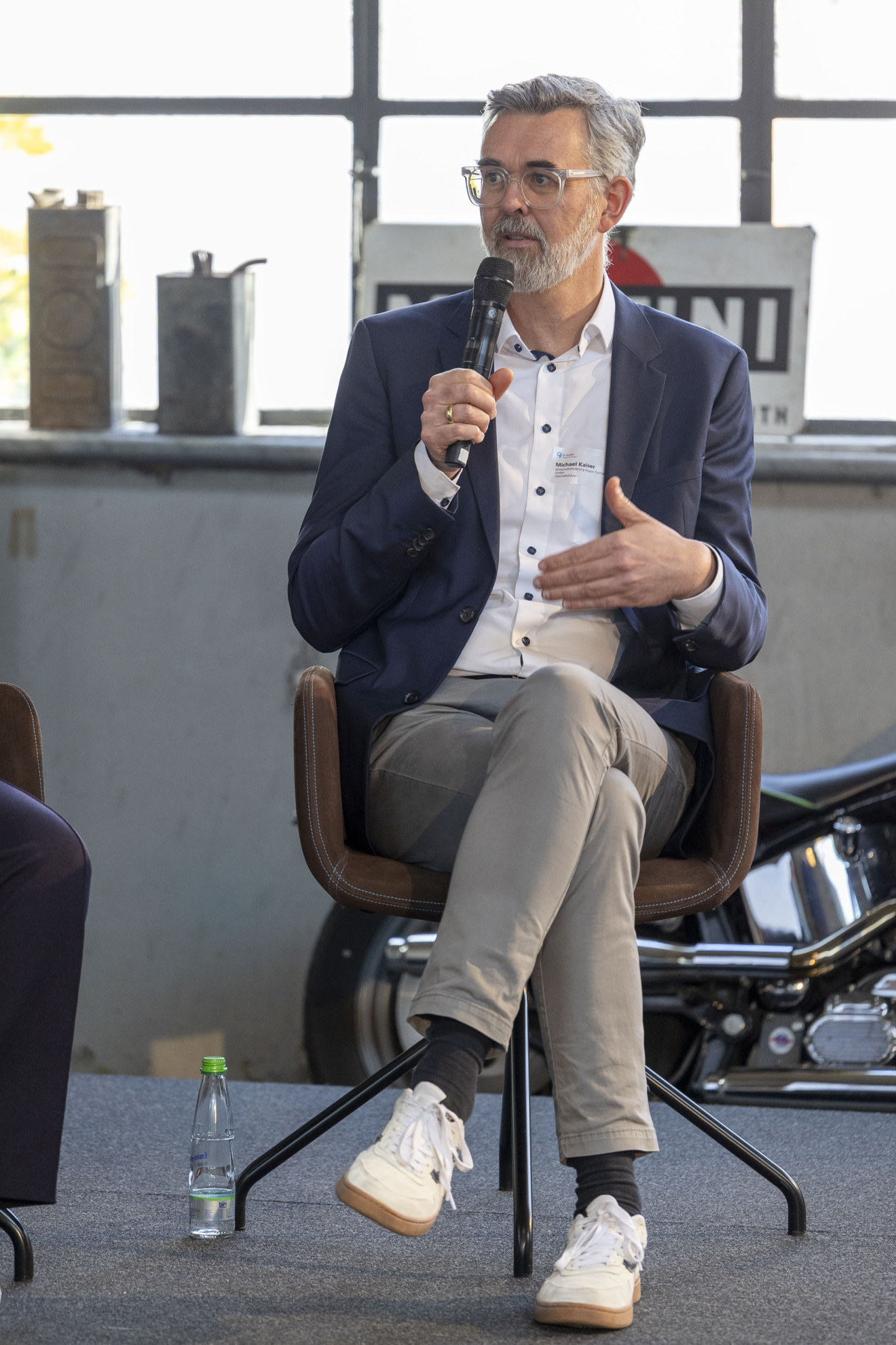 Zu Beginn beleuchtete Mustafa Kalay, wie Herausforderungen rund um das Verbrenner-Aus bei Bosch in Feuerbach zu langfristigen Veränderungen führten. Der Standort und seine Mitarbeitende waren stark im Bereich dieselbetriebener Antriebstechnologien verwurzelt, weshalb das Programm „Mission to Move“ damals ins Leben gerufen wurde und dabei half, die Belegschaft um- und weiterzuqualifizieren. Unter anderem wurden Fach- zu Elektrofachkräften umgeschult. Mit Erfolg: „Mission to Move“ soll in naher Zukunft bei Bosch auf rund 50.000 Beschäftigte ausgeweitet werden.