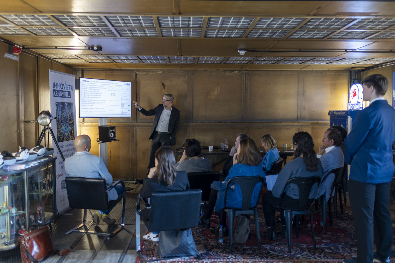 Im ersten Zukunftsraum gaben Robert Köhler und Markus Löpsinger (Bosch) sowie David Kunz (FAPS Uni Erlangen), Dr. Christoph Runde und Sven Haschke (VDC) Einblicke in „XR-Upskill“, ein Verbundprojekt mit der FAU Erlangen-Nürnberg und dem Virtual Dimension Center, das immersive Technologien (eXtended Reality) für die Aus- und Weiterbildung in der Elektromobilität nutzt. XR kommt in der Wirtschaft bereits branchenspezifisch zum Einsatz: zum Beispiel, um Prototypen zu erstellen, Produkte wie komplexe Maschinen zu designen und zu visualisieren, oder aber für Therapien und Rehas. Ziel des Projekts XR-Upskill ist es, das Know-how zu diesen Anwendungen weiterzugeben und für KMU sowie Berufs- und weiterführende Schulen zugänglich zu machen.
