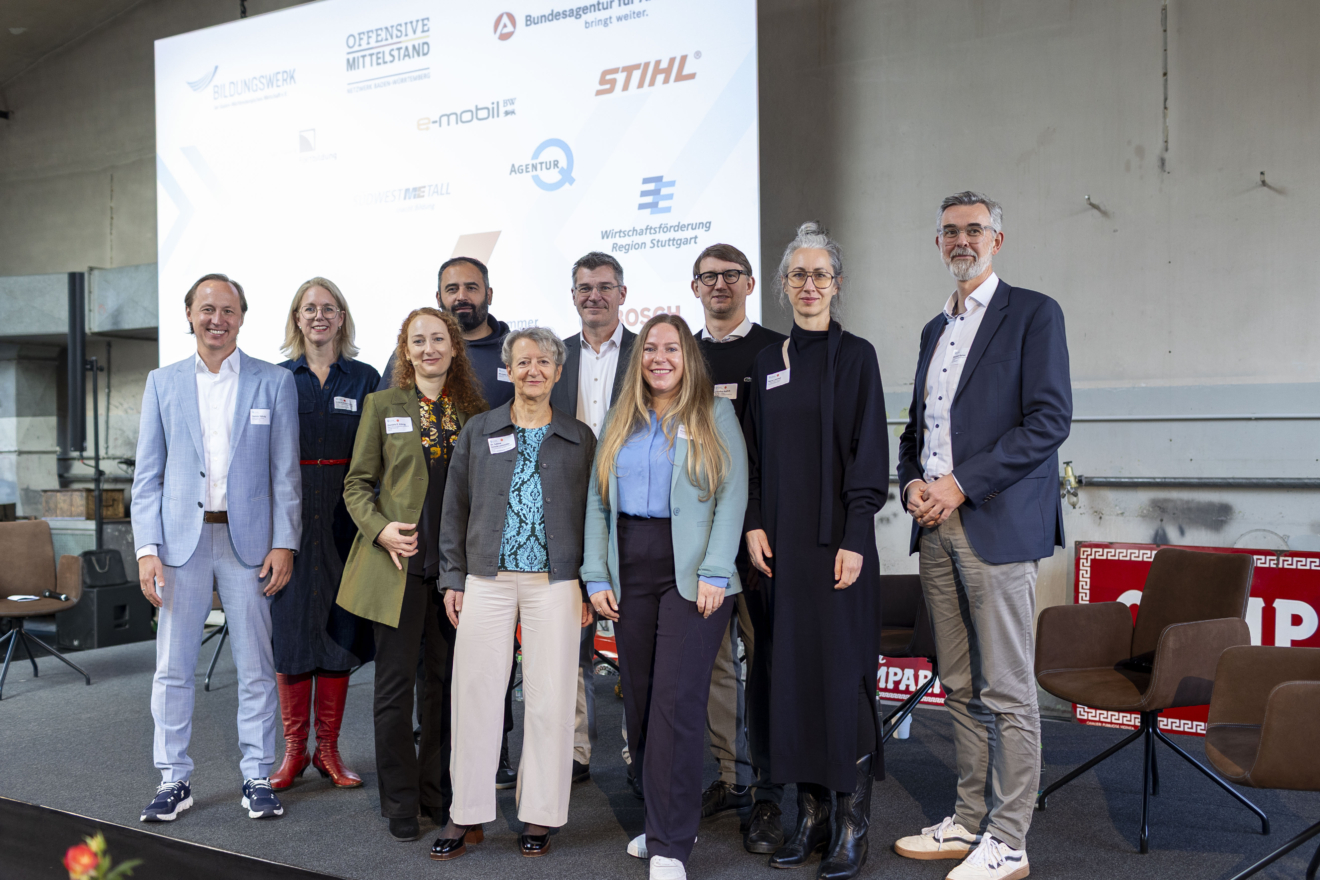 Verschiedene Stakeholder tauschten beim Panel-Talk Perspektiven aus: Michael Kaiser (Geschäftsführer der WRS), Nora Lämmel (Gewerkschaftssekretärin der IG Metall Region Stuttgart), Thorsten Würth (Referatsleiter Arbeitsmarktpolitik und Weiterbildung bei Südwestmetall), Claudius Audick (Referatsleiter für Berufliche Fortbildung bei der IHK Stuttgart), Anna Friederike Steiff (Community Managerin Region Stuttgart bei der KI-Allianz Baden-Württemberg), Mustafa Kalay (Betriebsrat bei der Robert Bosch GmbH) und Dennis Röhrig (Geschäftsführer des Blechbearbeitungsunternehmens Röhrig GmbH) diskutierten mit Daniela König, Leiterin des Regionalbüros für berufliche Fortbildung Stuttgart/Böblingen und Moderatorin des Tages, über den Umgang mit diesen aktuellen Themen.