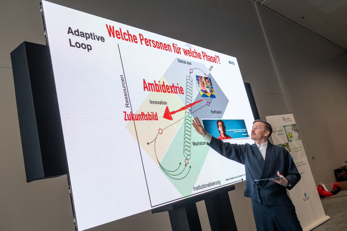 Gerade in einer Phase, die er nach C. S. Hollings Theorie des Adaptive Cycle als „Konfusionsphase“ beschreibt, eröffnen sich neue Möglichkeiten. Voraussetzung dafür ist jedoch eine klare Vorstellung davon, wohin die Reise gehen soll. Instrumente wie Strategic Foresight helfen, unterschiedliche Szenarien zu denken und daraus strategische Entscheidungen abzuleiten. Gleichzeitig betonte Aberle die Herausforderung von „Ambidextrie“: Unternehmen müssen ihr bestehendes Geschäft stabil halten und zugleich neue Perspektiven entwickeln.