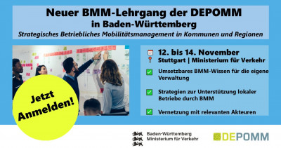 Mit dem Lehrgang „Strategisches Betriebliches Mobilitätsmanagement in Kommunen und Regionen“ bietet die DEPOMM in Kooperation mit dem Ministerium für Verkehr Baden-Württemberg im November 2025 zum ersten Mal ein eigenes Qualifizierungsangebot an.